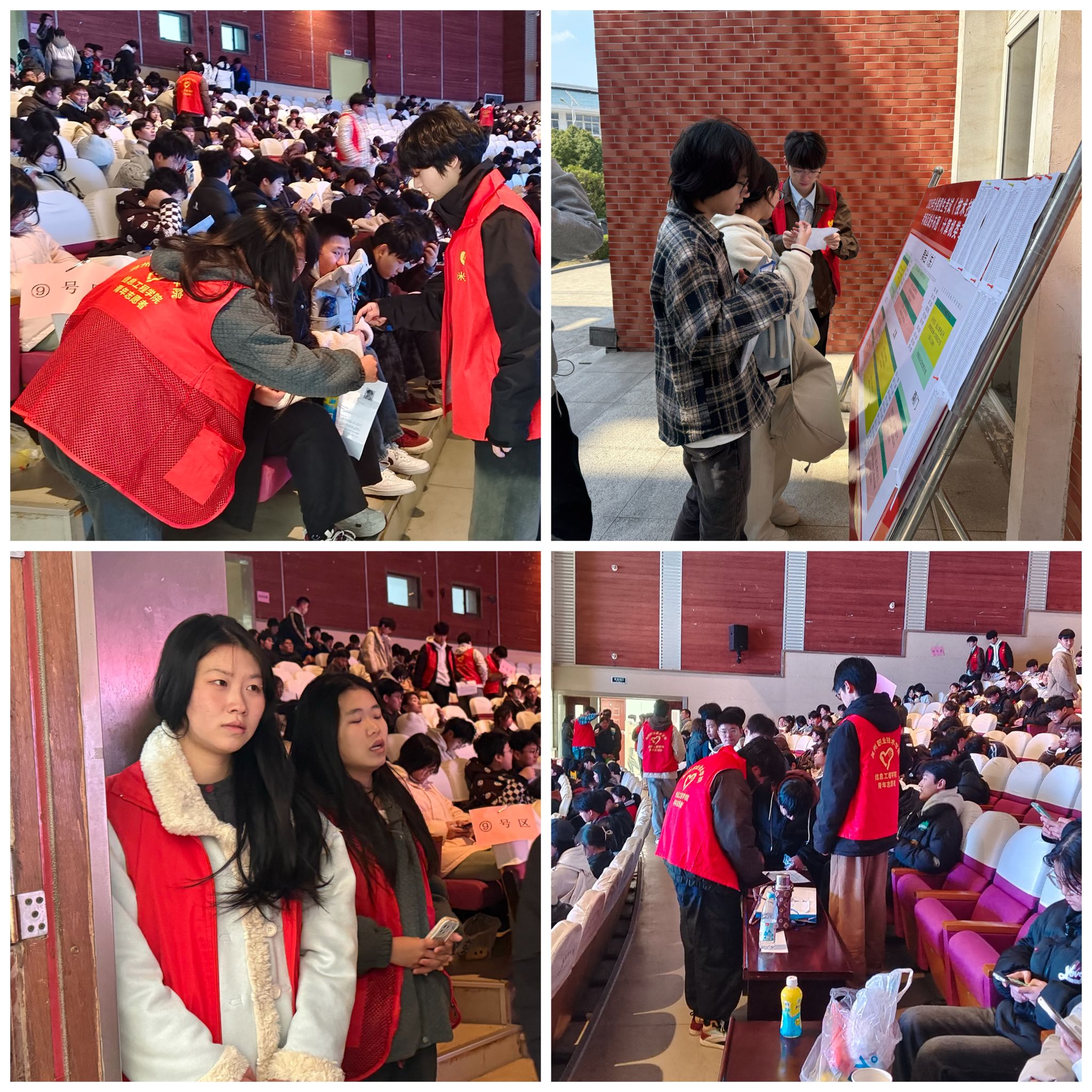 活动期间,志愿者身穿红马甲,面带微笑,帮助老师在校大礼堂进行秩序维护、点名等,同时给考生提供咨询,耐心解答,用温暖的话语缓解考生们的紧张情绪。在志愿者的引导下,考生们有序地前往综合楼机房的各个考场。